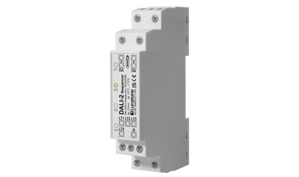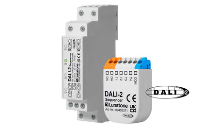 Lunatone DALI-2 Sequencer is a control unit to recall automatically timed instruction sequences. A sequence can combine various command-sequences and scene- recalls. 4 different sequences can be defined. The active sequence is started and stopped using DALI commands. Sequences can be executed once or looped. Housings for DIN Rail mounting and back box installation are available.