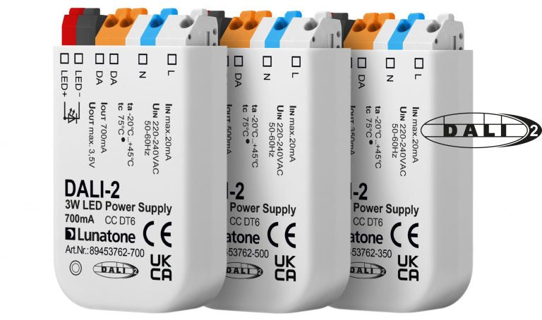 Lunatone 3Watt DALI LED driver with an input voltage of 220-240V AC. Devices with different output voltage ranges / output currents are available: 350mA, 500mA and 700mA.