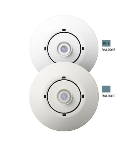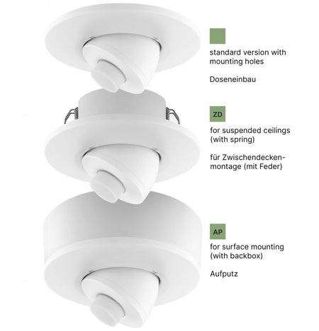 DALI-2 LS is available in three different housings: for direct mounting on cavity walls or installation boxes (standard), for suspended ceilings (with spring), or for surface mounting (with backbox). Available housing colours are pure white RAL 9010 and traffic white RAL 9016 (-W16).